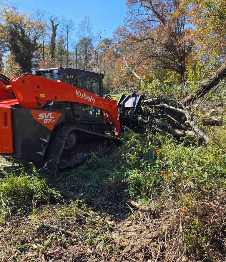 Clearing for residential properties, multi-acre tracts, storm debris, and challenging mountain terrain.